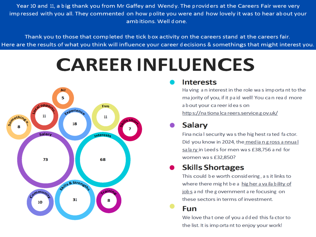 Students in Year 10 and 11 took part in our in-school careers fair in November. Representatives from local employers, colleges, sixth forms and universities came into school to speak to students about the opportunities for further study and employment in Leeds and beyond. It was fantastic to see so many former students returning to Cardinal Heenan to share their experiences in education and employment with younger students. As part of the fair, students took part in a survey about the factors which influence their decisions about future careers. The results are shown below.