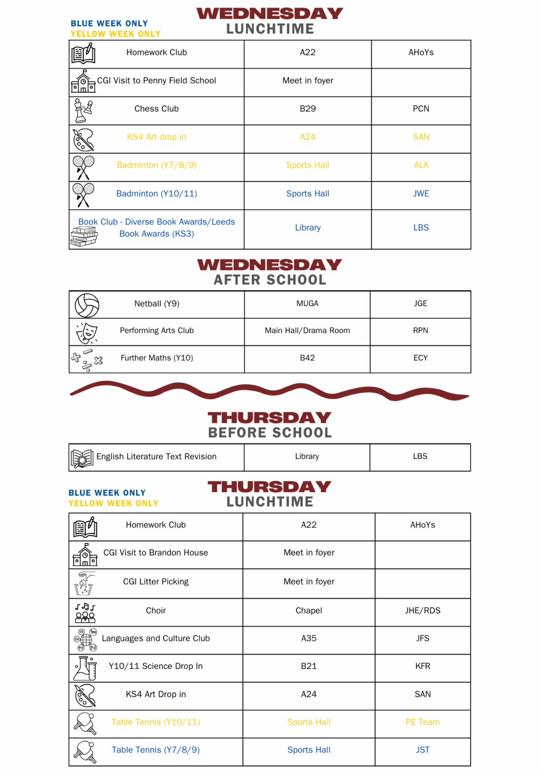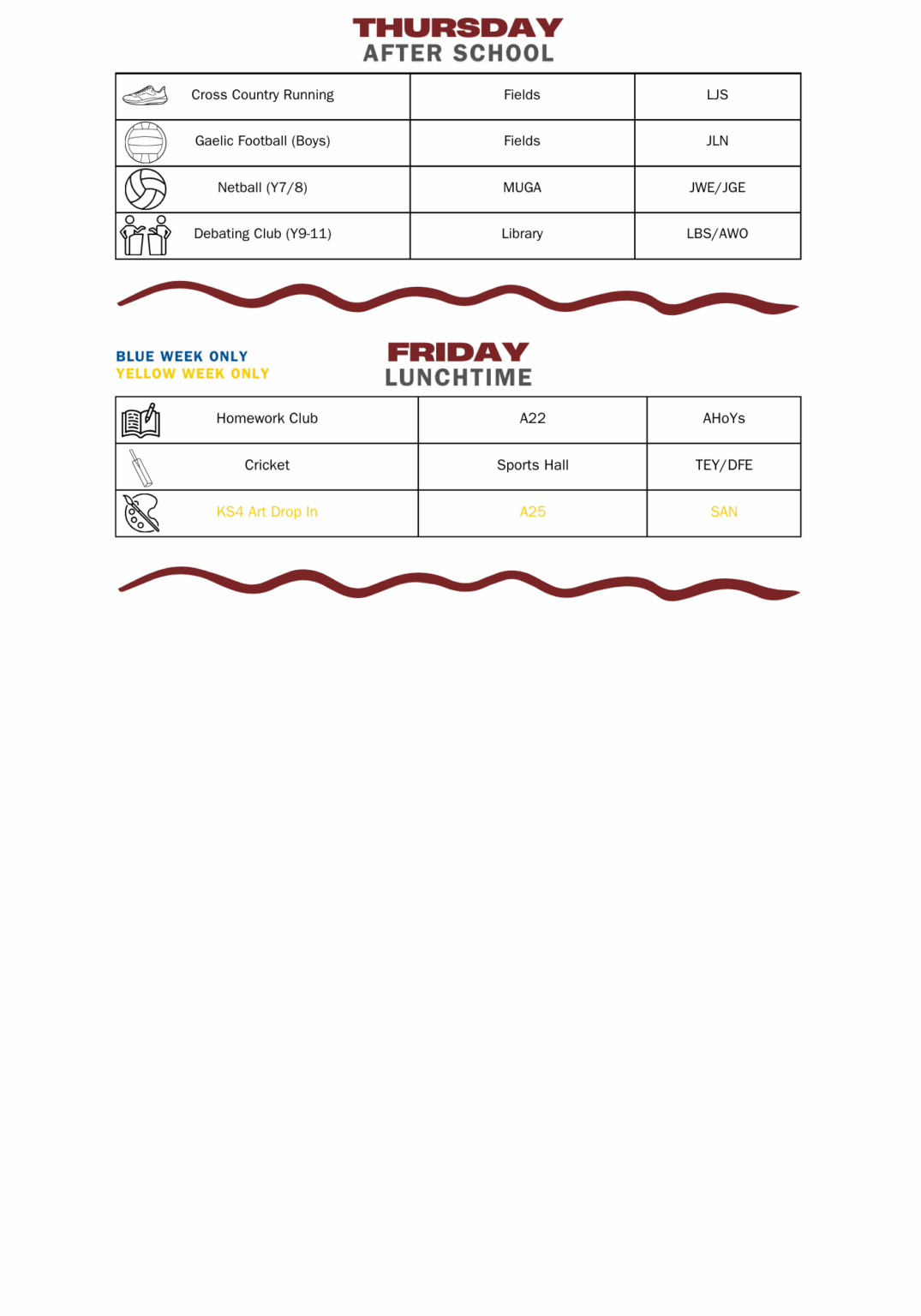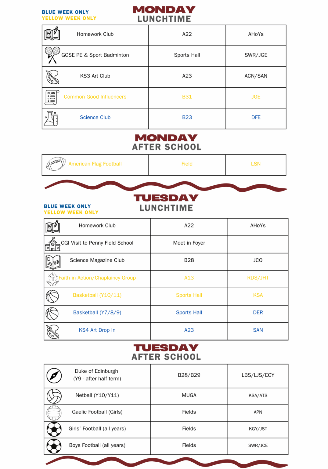 Afterschool activities are from 15:30 – 16:30 unless otherwise specified.